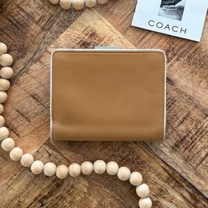 Elegant COACH framed wallet in camel leather. Sleek and functional design.Sized to accommodate more while looking great.