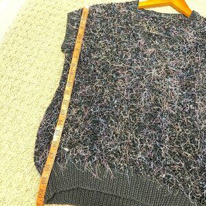 This vintage handmade sweater tee is a one-of-a-kind piece crafted with exquisite attention to detail. Featuring a black crochet knit adorned with vibrant 3D rainbow confetti accents, it boasts draping sleeves and a flattering V-neck collar for a chic, bohemian look. Circa 80s-90s, this timeless garment is perfectly crocheted, showcasing a unique and personal touch.