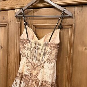 Crush Twist Front midi dress in Peach Lace Print linen and silk. It features adjustable velvet straps with rhinestones, sweetheart neckline, cut-out detail on the front, rear zip closure, two side welt pockets and relaxed skirt.