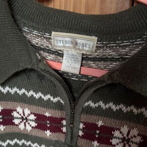 Cozy zip-up sweater with intricate patterns. Features olive and burgundy tones.
