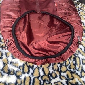 Has a hole for your dogs leash and two drawstrings on the bottom in case it’s a bit big on your dog.