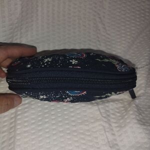 Charming quilted cosmetic bag with owl print. Features a dark blue background with colorful accents. 7"x4" x2"