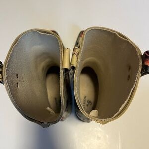 Funky, fun, and unique rubber rain boots. Day of the Deas vibes. Pointed toes, removable in-soles, block heels, bright and vibrant skull and rose print. Good preowned condition. See pictures for some marks /scuffs on shoes, wear on soles. 13" tall from bottom of heel to top of shaft