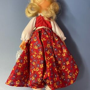 Charming vintage doll with a lace-trimmed dress. Features a red floral skirt and a green apron.