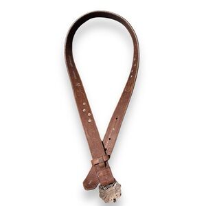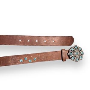 BRIGHTON Brown Leather Belt Blue Enameled Flowers Buckle w/ Embroidery &…