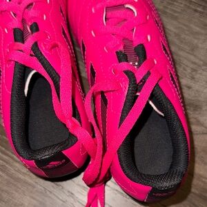 New never used with out tags. Pet free smoke free. Size 13.5 pink adidas soccer cleats. Bold neon pink soccer shoes with sleek black details. Ideal for dynamic play.