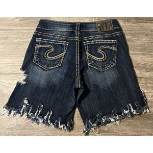 Excellent, pre owned condition women's Silver Jeans Suki Shorts. Reputable, popular jeans brand name. Designed with materials that give a slight amount of stretch for ease of movement and a more comfortable fit. Mid rise fit with a dark wash finish. Excellent factory distressing/destruction details with a raw hemline of fringe and thick stitched seam detail as well. Studded front pockets, big button closure. Signature embroidered logo S on back pockets and logo brand patch on backside waistband. No noticeable flaws or stains. Measurements included to help with sizing.