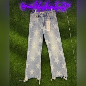 Stylish wide leg jeans. Features heart patches. Perfect for casual wear.