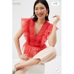 NEW Geisha Designs Anthropologie Ruffled Tulle Sheer Velvet-Trim V-Neck Blouse