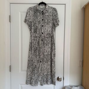 Elegant maxi dress with button-up design. Includes a matching belt for a tailored look. Belt has some small tears around the buckle. Over all good condition.