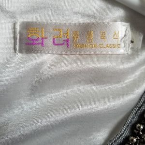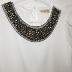 Embellished Blouse Neckline Silvertone Beads Ruffled Short Sleeves White Small