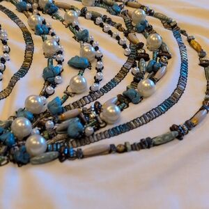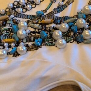 I paid $200 for this shirt, brand new and I've maybe worn it five times. I bought it for a photo shoot that I did and I don't know that I've really worn it much since. it's very much in like new condition. The chunks of turquoise are real and I had considered pulling them off and doing something else with them instead of selling it. but I wanted to see if someone else would want to wear this beautiful shirt before I tear it apart. it's kind of heavy in the front because of all the turquoise and pearls. All of the beads are real. it's a size XS, but fits a bit larger.