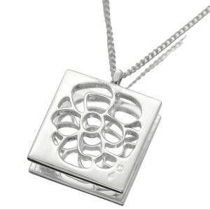This exquisite CHANEL necklace showcases a modern geometric design with a silver square pendant featuring a delicate cut-out floral pattern. The pendant is elegantly suspended from a 17” classic sterling silver chain, offering a sleek and contemporary aesthetic. Perfect for daily wear if desired. Pendant measures approximately 2.2cm x 1.8 cm. Excellent 9.8/10 condition.