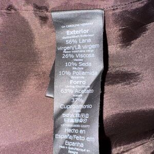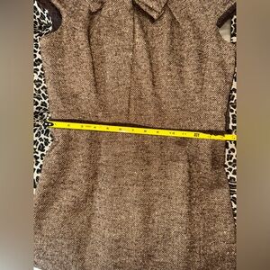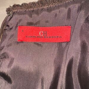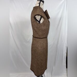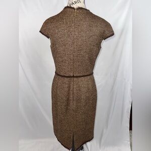 Carolina Herrera designs clothes for women’s bodies! This elegant brown tweed dress is perfect for any occasion. Its classic design offers a timeless look. Beautiful integrated bow is unique and sophisticated. The delicate fringe around my neck, arms, and waist provide at a touch of flair. Hidden back a zipper. Kick pleat in the back provides added room for walking.