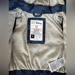 Comfortable Baby GAP jacket with a soft gray inside fabric. Features Disney blue accents for a stylish look. Also, has a detachable hood.
