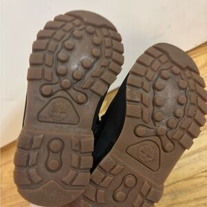 Stylish Timberland boots with black exterior and tan lining. Ideal for active kids.