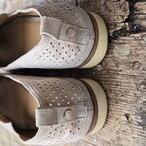 Suede-like. Momcore. Grandmacore. Grandadcore. comfortable. neutral. beige. basic. easy. simple. Slip-on shoes. flat rubber soles. Conservative. Classic. Loafers. Comfort shoes. Casual. Walking shoes. Lightweight. Closed toe. versatile. stylish. cushioned. perforated suede loafers. materials appear man made.