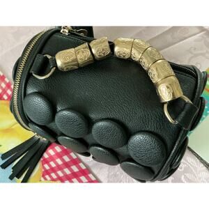 This women's handbag features a stylish button and zipper closure with black and silver tassel accents, adding a touch of flair to the floral patterned exterior made of leather. The shoulder strap handle is a combination of black leather and silver metal, with a hardware color that matches the accents. The small size and compact design make it perfect for on-the-go use, while the interior fabric lining adds a luxurious touch. Additionally, this designer handbag from Brighton includes a key holder accessory, making it a fashionable and practical choice for any woman in search of a chic shoulder bag.