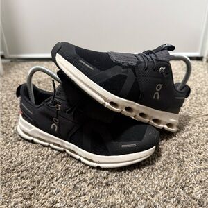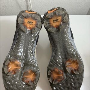 Dynamic Nike trail shoes with blue and cream design. Speckled sole and orange highlights.