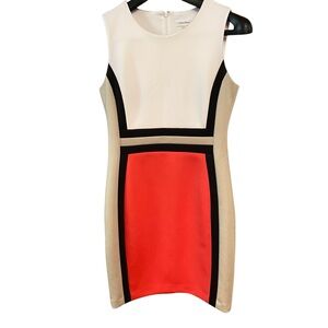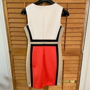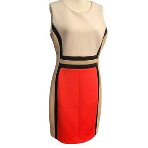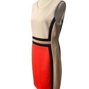 Elegant midi dress with bold red and white color block. Features black trim accents. Sleeveless design. Perfect for any occasion.