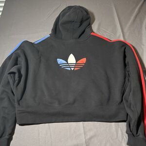 Adidas Originals Trefoil Crop Hoodie Black Red Blue Stripe Trim Women’s Size M