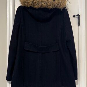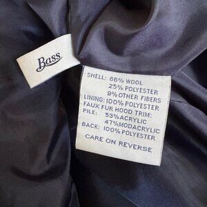 Women's size Large BASS jacket. It is a very deep navy blue that looks black in some lights. It has a removable faux fur hood. 2 faux front pockets. Fully lined and double breasted. Shell: 66% Wool, 25% Polyester, 9% Other Fibers. Lining: 100% Polyester. Pile: 53% Acrylic, 47% Modacrylic. Back: 100% Polyester. It is in excellent condition. Smoke free home.