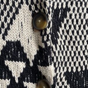 Brand new condition, never worn. This cardigan sells out every single year. I needed the small, but never returned to the medium before the return window closed. This is the softest sweater ever and looks great with everything! Runs large. Chic knit cardigan with bold patterns. Features black and tan colors. Ideal for layering.