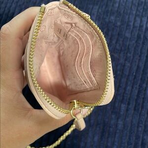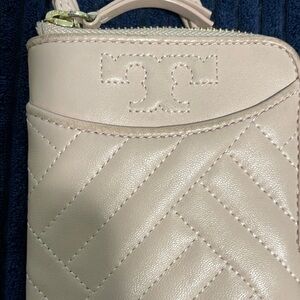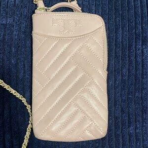 Tory Burch quilted phone crossbody with a gold chain strap. Features iconic Tory Burch emblem.