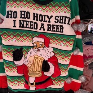 Vibrant green sweater with black accents. Ideal for festive occasions. With lights and Ho Ho Holy Shit I need a beer.