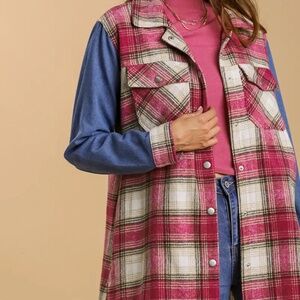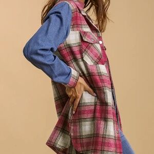 New UMGEE Plaid Flannel Fringe Shacket Magenta Pink Snap Up Denim Sleeves