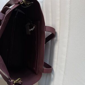 Medium size leather tote (12 h x 11 w x 5 )with a rich burgundy hue. Perfect for daily use. Stylish and functional. New with tags. One small scuff line on pocket.