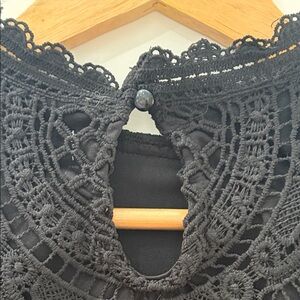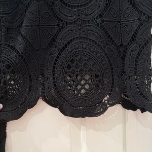 Chic black crochet lace blouse with intricate patterns. Bell sleeves. Perfect for stylish outings. Pair with jeans or skirts.