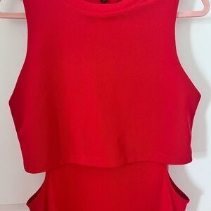 This striking red sheath dress from Topshop is designed for cocktail events and nights out. Featuring a sleeveless design and a crew neckline, it boasts stylish side cutouts that add a modern twist to its sleek silhouette. The midi length ensures a sophisticated look, making it a standout piece for any evening occasion.