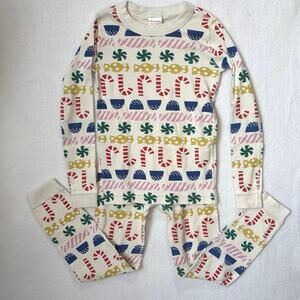 Adorable 2-piece Hanna Andersson holiday pajama set featuring a festive allover print with candy canes, peppermint swirls, stockings, and holiday motifs in classic bright colors. Made from Hanna’s signature soft, durable organic cotton—perfect for cozy winter nights and holiday photos!