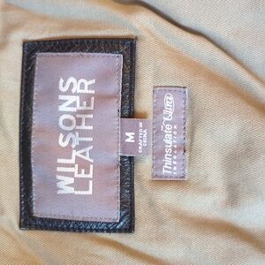 Very gently worn men's Wilson Leather Jacket, black, size medium. No longer fits my husband that barely worn it to begin with since he runs hot. Leather is in excellent condition and has no damage. Thinsulate lining can be unzipped and removed. Sooo many pockets. Also has baggie of spare snap.