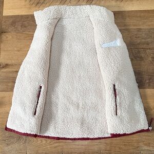 NWOT puffer vest. Purchased at a winery in California. Very thick and warm. Zip pockets on the inside, open pockets on the outside. Technically it’s reversible but the logo does show on the sherpa side. Never worn or washed.