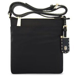 TOMMY STYLE, TO GO: This must-have small crossbody is polished off with glossy gold tone hardware and a luggage tag featuring the TH monogram.