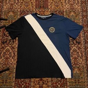 * y2k 00s Nautica Embroidered cut and sew blue black and white diagonal asymmetrical striped big logo flags graphic double sided tee shirt