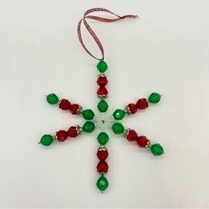 Festive snowflake ornament with red and green acrylic beads and frosted glass seed beads. Perfect for holiday decor.