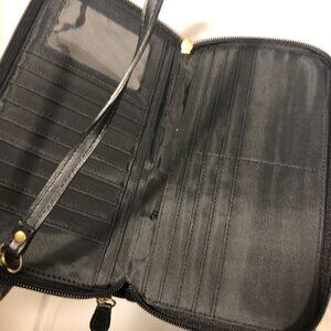 Vintage - Longaberger wallet / shoulder bag, material is black corduroy and black faux leather outside, zip around closure, front zip pocket, several compartments, including card holders, measures approximately 8.5"x 5"x 1", shoulder drop 23",