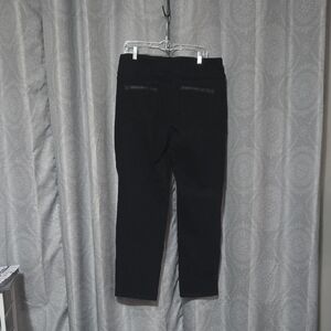 Sleek black with leatherette detail at pockets, straight leg jeans. Versatile and stylish. Ideal for any outfit.