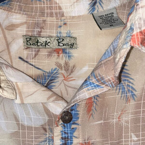 This is a Batik Bay shirt, size M. It features a beige base with a tropical print of palm trees and leaves in shades of blue, white, and orange. The shirt has short sleeves, a button-down front with brown buttons, and a classic collar. There are two chest pockets. The material is 100% rayon.