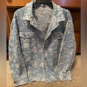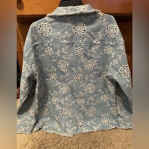 Stylish blue denim jacket with intricate white embroidery. Perfect for adding a chic touch to any outfit.
