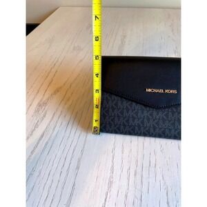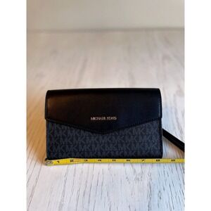 Keywords: Michael Kors wristlet, MK logo clutch, designer wallet, black leather, gold hardware, signature print, evening bag, travel accessory, everyday clutch, fashionable, luxury, women's accessory