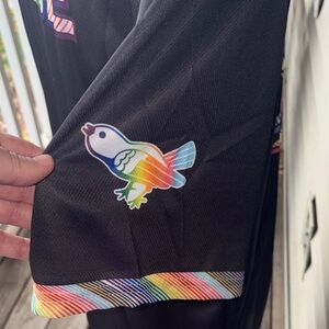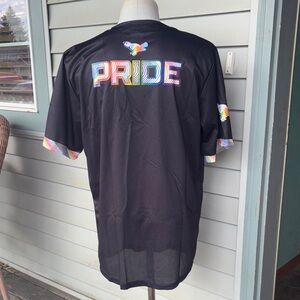 Support your team with this Orioles pride jersey. Featuring a classic black base with vibrant multicolor details, it's perfect for any fan. Comfortable and stylish, this jersey is a great addition to your wardrobe. Great pride colors on front, sleeves, and back. Official Orioles merchandise. Never worn. XL and medium sizes available.