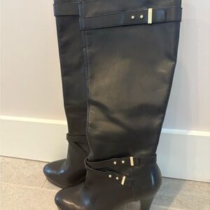Elevate your look with these chic black heeled boots. Featuring stylish strap details, they are perfect for any occasion.