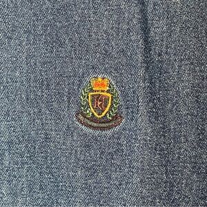 This vintage Hunt Club denim jacket for men in size XL features a full zip closure, bomber style with elastic waist, and button-down collar. Made of cotton denim in a solid blue color. Embroidered logo on lapel. Unlined & perfect for layering.