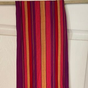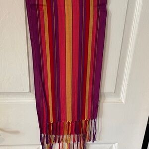 Elegant scarf with rich red and purple tones. Features subtle stripe accents.