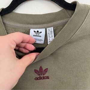 Comfortable olive green sweatshirt featuring Adidas logo in a burgundy embroidery. Oversized fit. Raw hem. Overall in good condition. No holes, no snags.