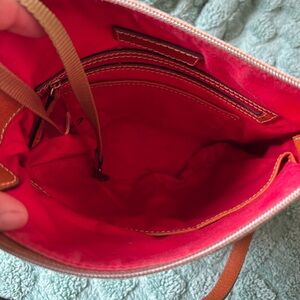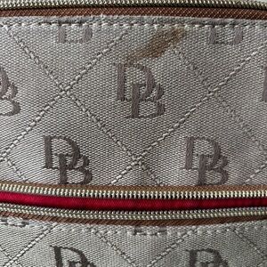 Elegant Dooney & Bourke bag featuring a brown monogram pattern. Red accent adds a pop of color. Perfect for everyday use. Has some stains as seen in pictures other than that great condition.